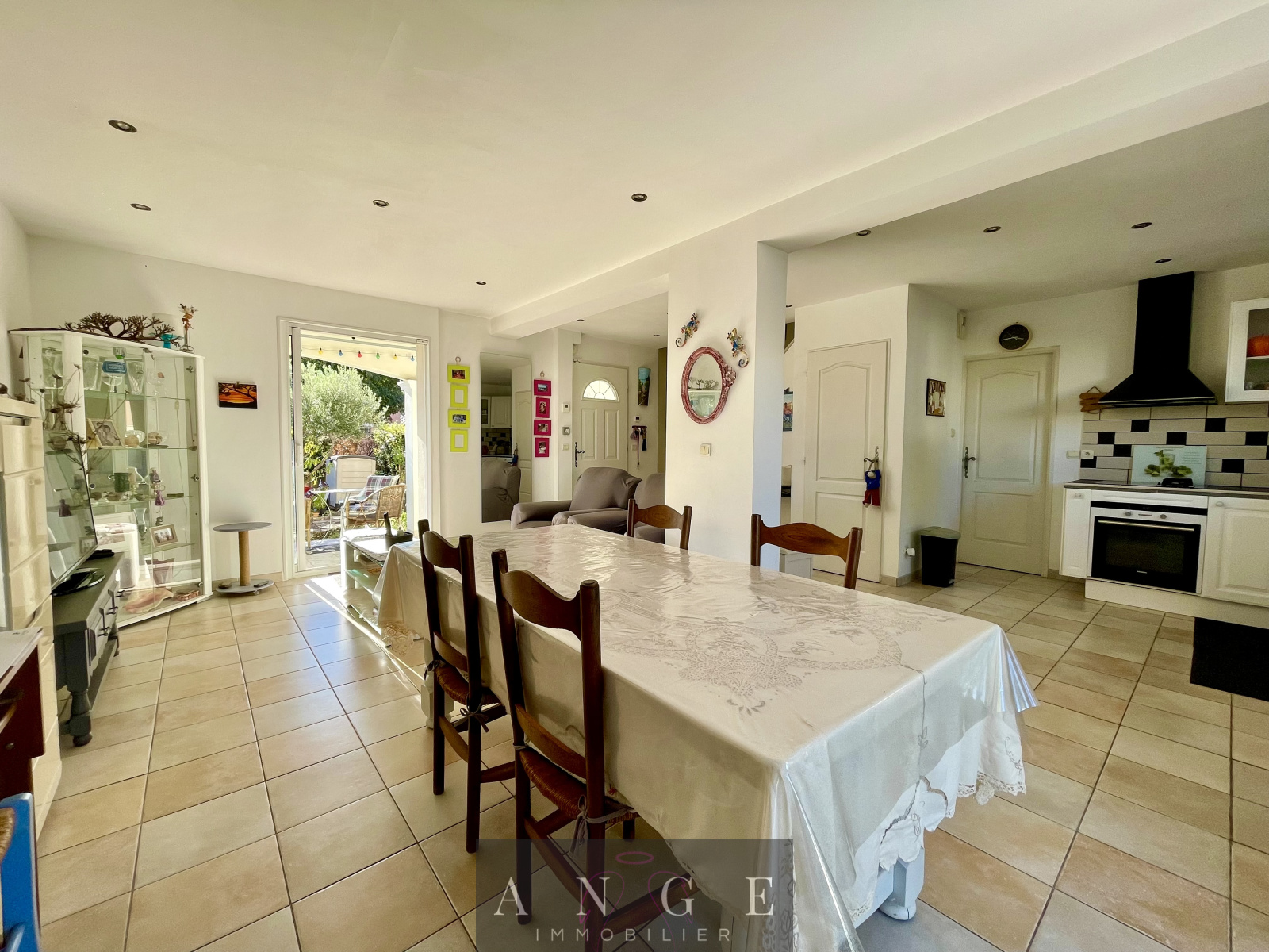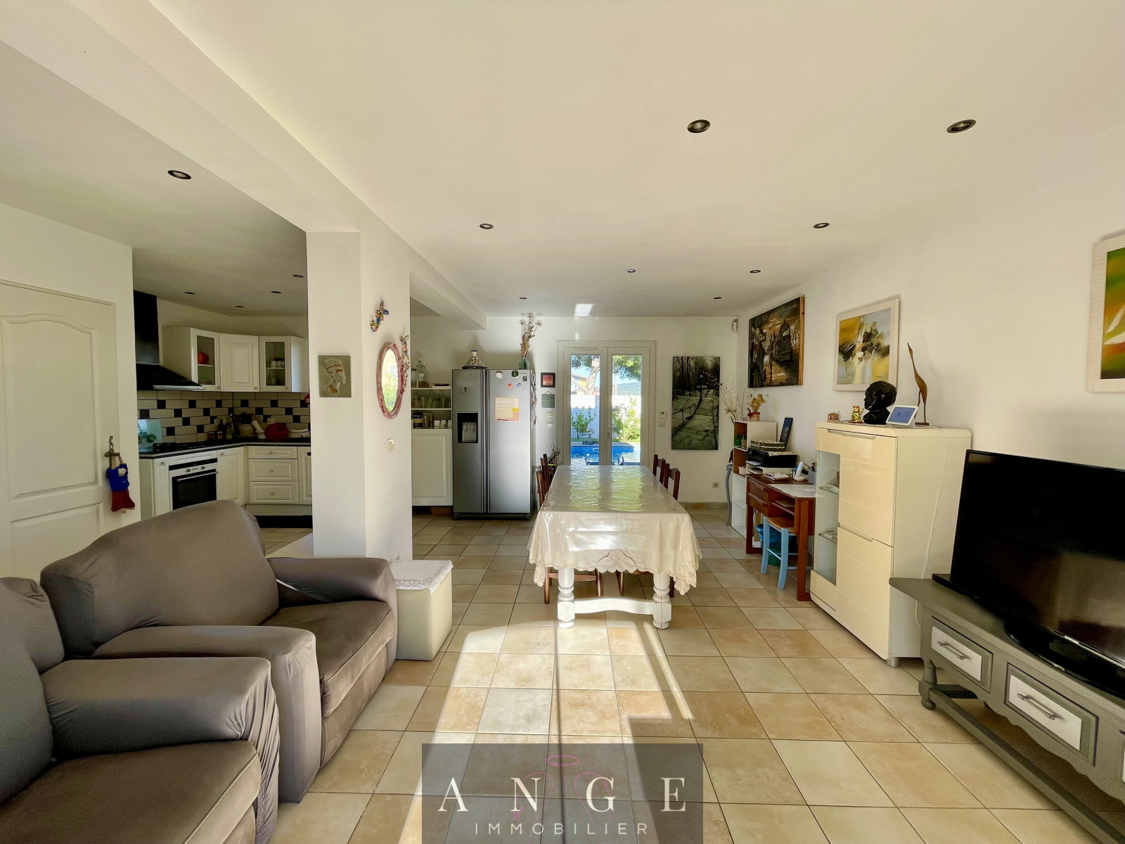 Belle pièce de vie lumineuse et traversante ouverte avec cuisine fonctionnelle, garage attenant aménagé en chambre avec salle d'eau.
