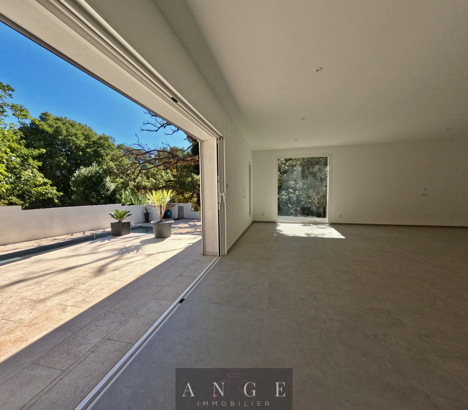 Espace de vie, une très grande pièce lumineuse, avec de larges baies vitrées, ouvrant sur la terrasse et la piscine.