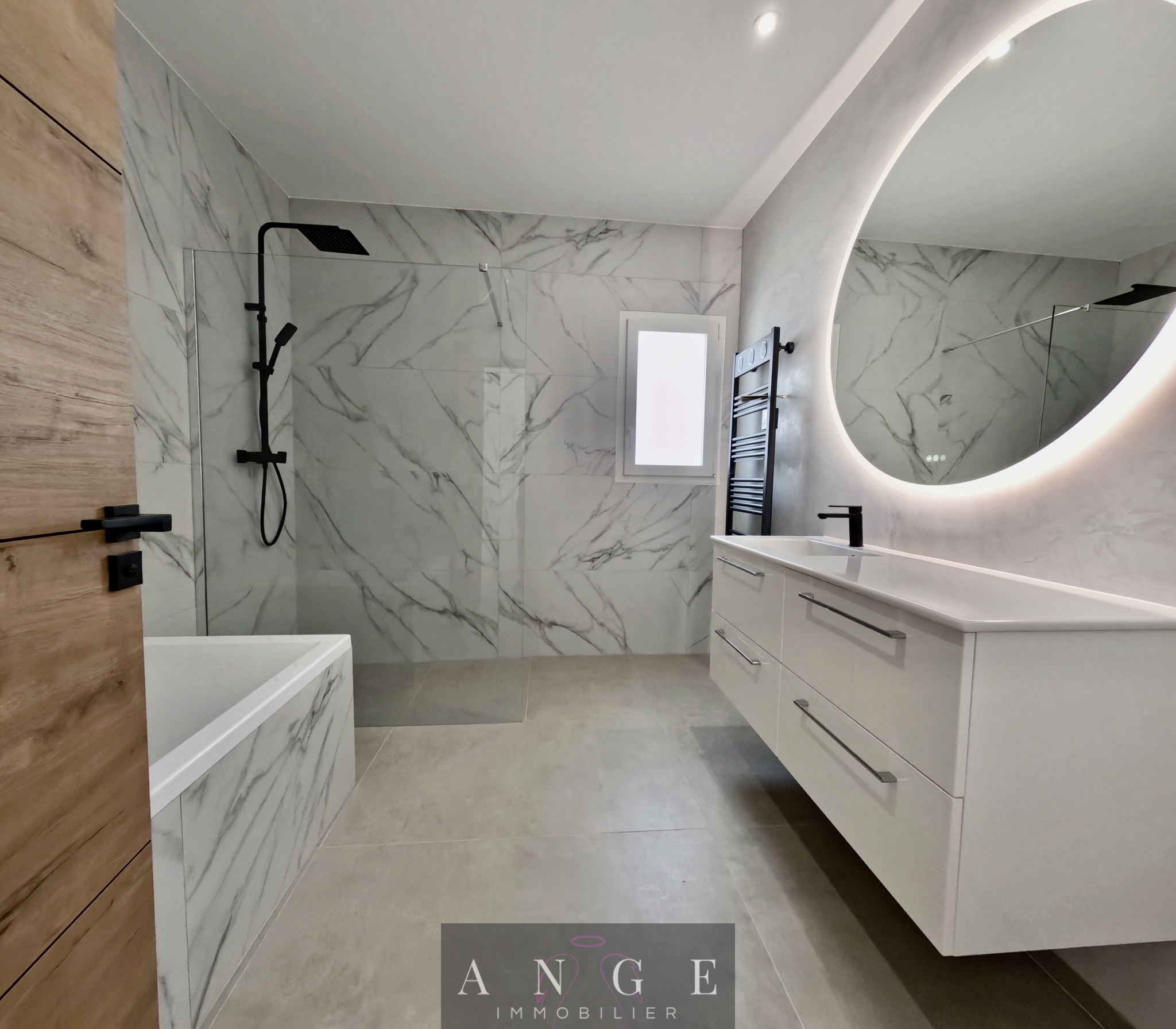 Elle propose 122m2 habitables, jamais habitée avec des prestations haut de gamme: clim réversible, baie galandage, volets roulants, carrelage 120x120...