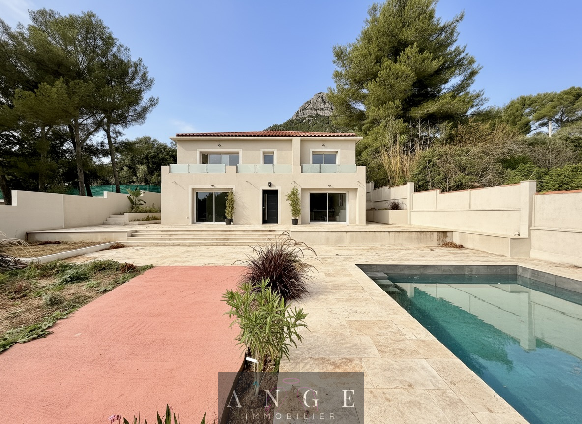 Développant 250m² habitables sur un terrain paysagé de 1000m², elle offre 6 chambres, un double garage, et une piscine traditionnelle 9x4,50m dans un cadre privilégié avec vue mer et sur le Mont Coudon.